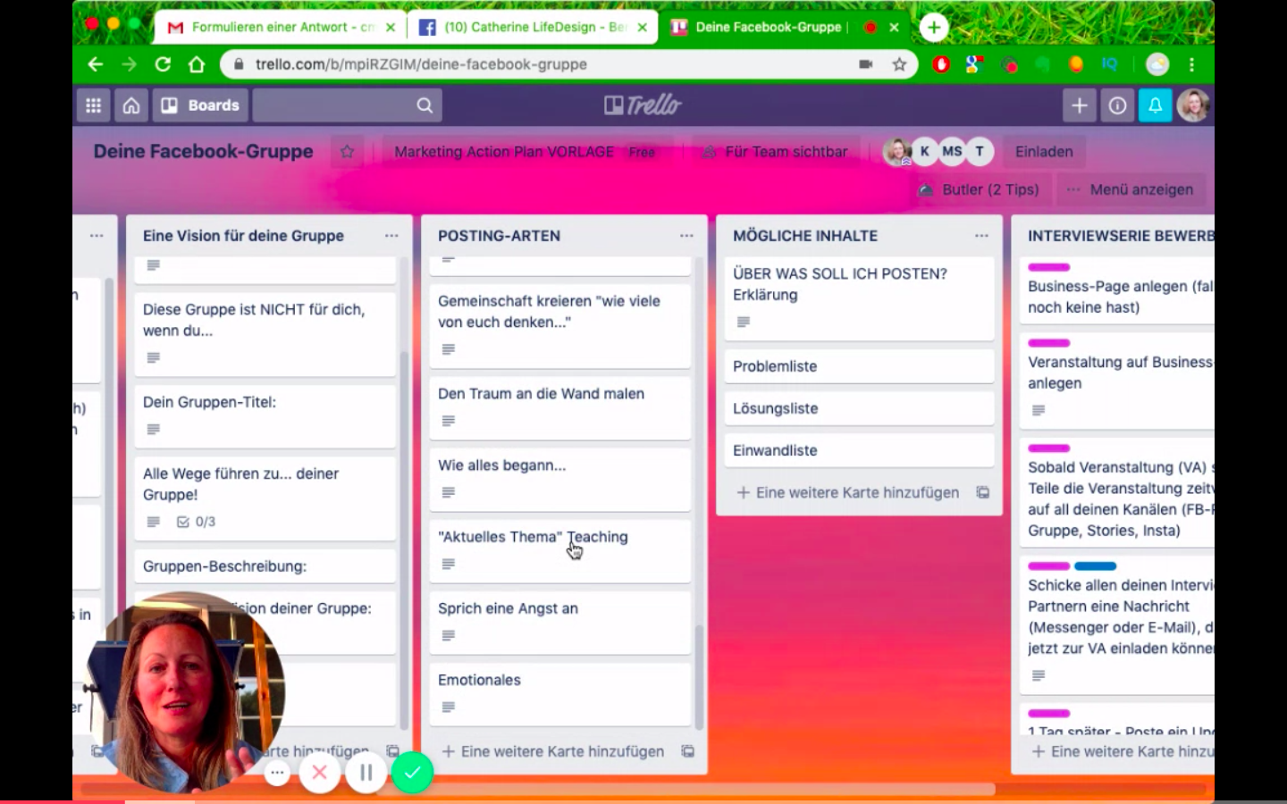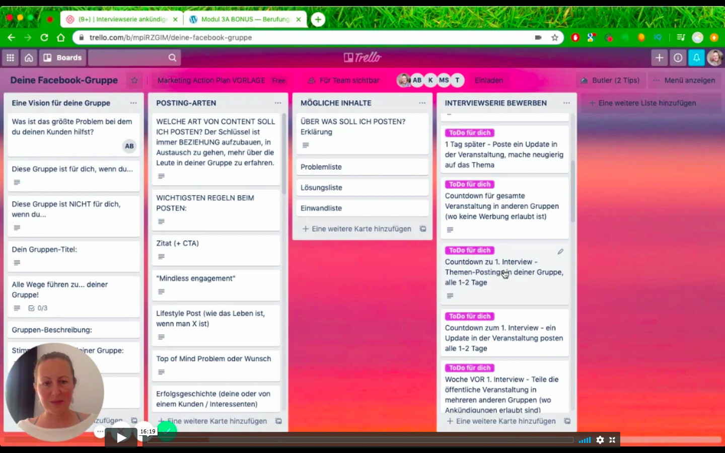 In den Videos hier zeige ich dir, wie du deine Interviewserie bewerben kannst (im nächsten Video findest du noch mehr Details, wie du deine Serie ankündigen kannst, auch in Gruppen, wo keine Werbung erlaubt ist). Gehe dazu wieder in das Trello-Board. Dort findest du eine Liste "Interviewserie bewerben" mit den einzelnen ToDo's (Link unter dem Video).